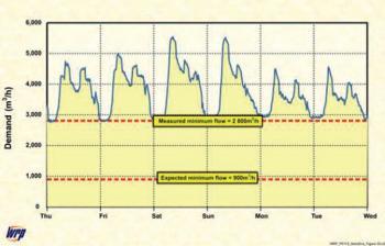 The leakage at the start of the project was known to be extremely high, as indicated by a minimum night flow (MNF) in the order of 2800m3/hr (see Figure 1). This was one of the highest MNFs recorded anywhere in the world and represents almost two Olympic-sized swimming pools of water every hour during a period when demand for water should be minimal. It should be noted that there is virtually no storage in the Sebokeng & Evaton areas, either at the bulk reticulation level or domestic property level. The high MNF is therefore almost completely due to leakage,most of which occurs inside the properties and is therefore not evident from normal visual inspection. It should also be noted that since most of the leakage occurs inside the households, the leaking water returns to the sewage treatment plant through the sewer network,which is often overloaded to such an extent that spillages of raw sewage into local river courses are a common occurrence in the area.