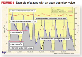 The fifth example, shown in Figure 5, is a more complicated and interesting case in which both pressure and flow are presented for the zone inflow to an area controlled by a pressure-reducing calve (PRV) that was initially thought to be discrete. In this case, it can be seen that after a few days the MNF drops to zero and, at the same time, there is an increase in pressure at the downstream side of the PRV. It should always be remembered that there will always be some level of MNF in a zone and the MNF will never drop to zero, even after rigorous leak detection. If the flow into the zone drops to zero, then it suggests that the MNF is being supplied from another source, which immediately points to some breach in the zone. In this particular case, a boundary valve has been opened, which has little influence during the peak daily demands but during the off-peak demand periods when the inflow to the zone is low, the connection is capable of pushing up the overall zone pressure. When the zone pressure at the downstream side of the PRV increases above the pressure set at the PRV, the valve closes and all flow through the valve stops – hence the zero MNF.