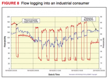 Live logging is not restricted to municipalities and is also very useful to individual consumers, particularly large industrial water users as can be seen from the graph shown in Figure 8. The graph shows the flows being used by a relatively large industry and it is clear that some form of tank is being filled every hour or two. This practice of intermittent filling causes serious pressure fluctuations in the water reticulation system in the vicinity of the industry and was creating problems for the municipality and other nearby industrial users. On presentation of the logging results to the industry in question, they were happy to modify their abstraction process to a more constant rate of abstraction that would not create large pressure fluctuations in the reticulation. Industries are often unaware of the demand pattern they impose on the municipal network and the live logging is of great use and interest to their water managers who generally wish to ensure that they are using water responsibly.
