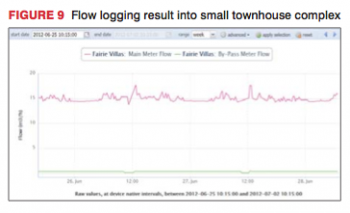 Another interesting example is presented in Figure 9, which shows the flow entering a small complex containing around 50 townhouses. After receiving an unusually high water account for two consecutive months, which was approximately R50 000 higher than normal, the owners realised that it was not a mistake and that they had a leak. A GSM/GPRS logger was installed for a few days and immediately picked up the fact that there was a leak of approximately 14 m3/h within the complex. The leak was repaired and the water use dropped back to normal in the following week. This example highlights the fact that such flow logging is not limited to large users, but can also be very useful to small townhouse developments. The typical cost of such a logger and the annual communication charges is generally between R10 000 and R20 000 per annum, which is often well below the cost of water lost through even a modest leak. Such logging is also very useful in identifying any small leak that is gradually increasing with time as this can easily be picked up by the gradually increasing MNF.